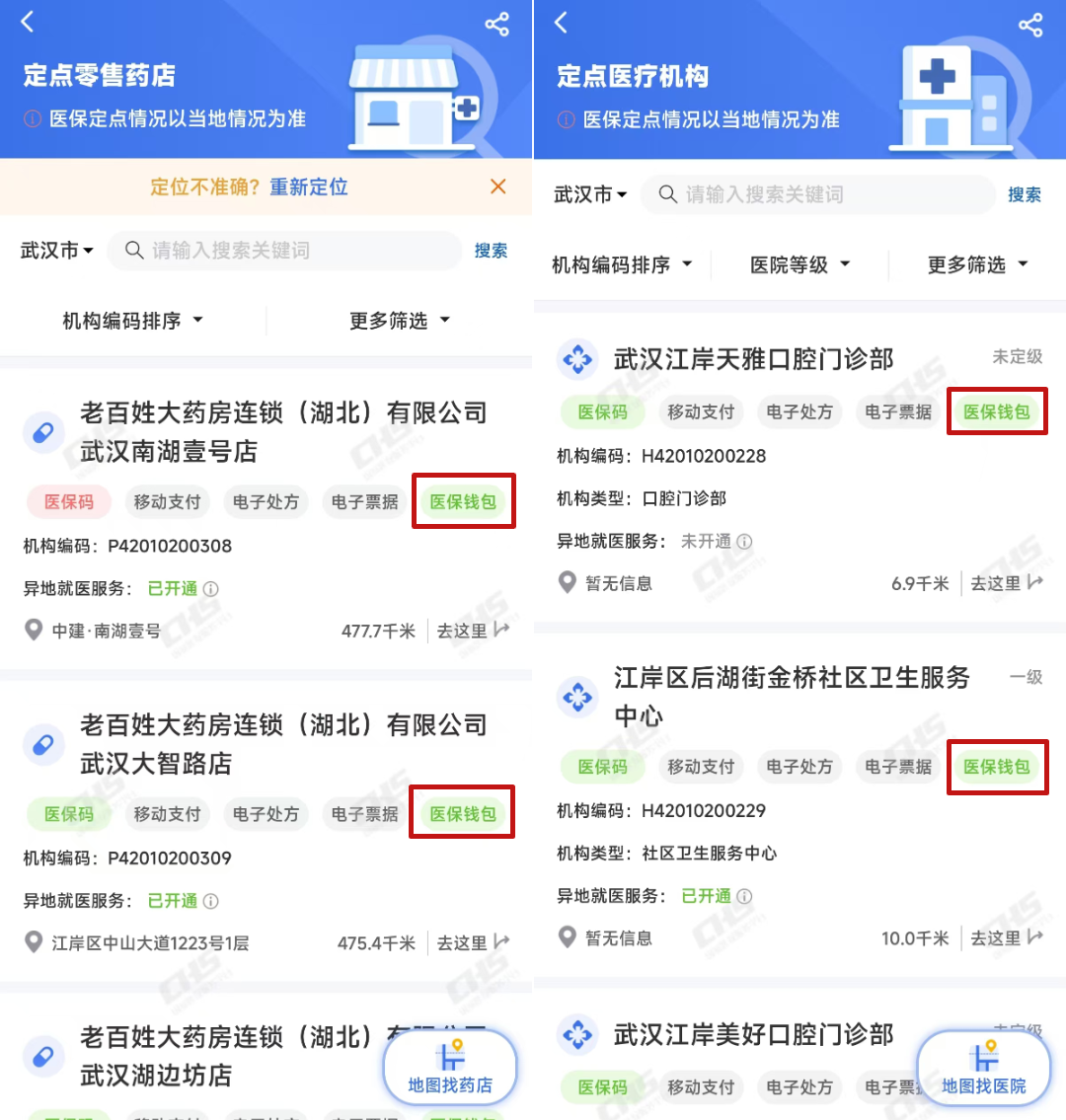 通过国家医保服务平台App查询服务,“定点医疗机构”和“定点零售药店”,可查询当前已开通医保钱包支付的定点医药机构。