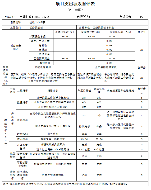 1.统战工作经费项目绩效自评综述:项目全年预算数为69.36万元,执行数为69.36万元,完成预算的100.0%。主要产出和效果:全年组织开展区委与区各民主党派座谈会4次,组织开展民主党派基层组织建设专题培训班2期,组织民族宗教专题培训2期,全面完成市区绩效目标任务。发现的问题及原因:绩效目标值的设定未能完全反映统战工作相关要求,相关科室在执行项目经费绩效目标时,对绩效管理认识不深。下一步改进措施:进一步细化绩效目标设定,科学合理地制定目标值,加强对部机关各科室项目经费绩效目标管理意识。
