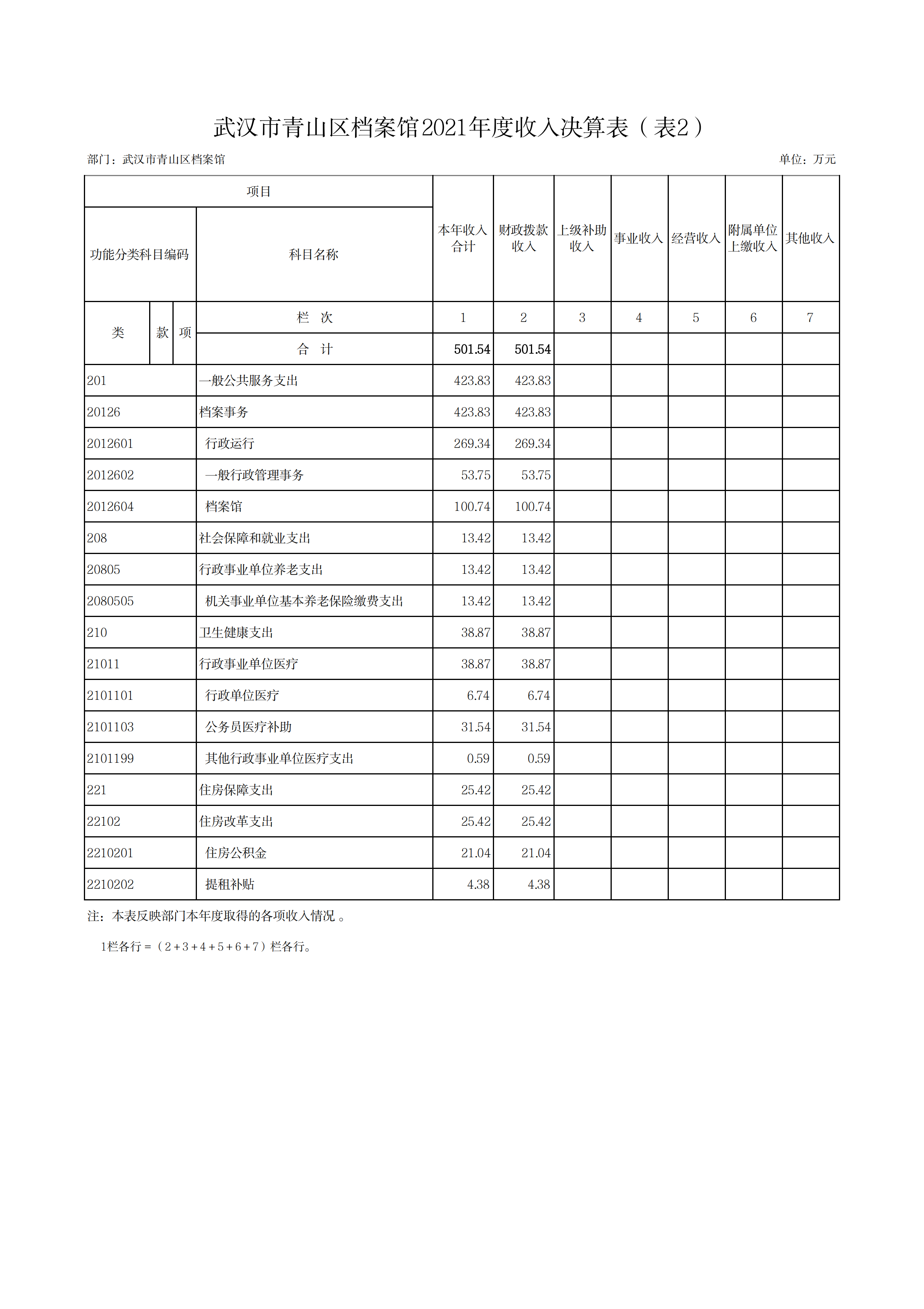 2021年度收、支总计501.54万元。与2020年度相比,收、支总计各减少196.39万元,下降28.14%,主要原因一是1名在职人员到龄退休;二是2020年因业务评查和疫情原因,增加了业务评查经费及疫情档案整理经费。