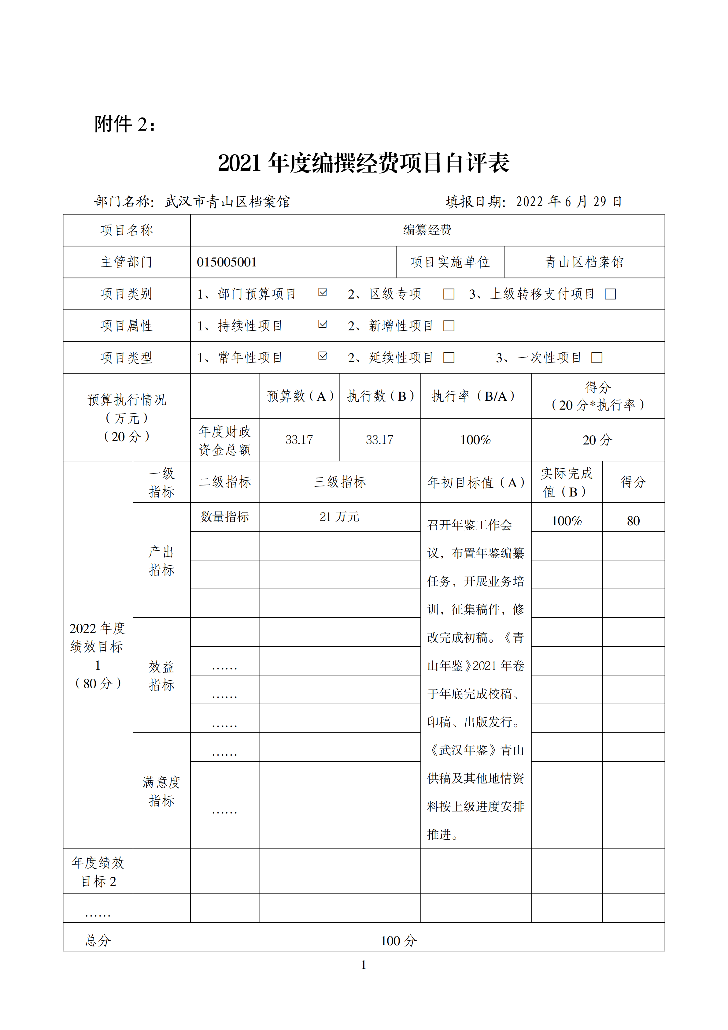 2.编纂经费项目绩效自评综述:项目全年预算数为33.17万元,执行数为33.17万元,完成预算的100%。主要产出和效益是:用于召开年鉴工作会议,布置年鉴编纂任务,开展业务培训,征集稿件。《果博东方 年鉴》2021年卷于年底完成校稿、印刷、出版发行。《武汉年鉴》果博东方 供稿及其他地情资料按上级进度完成。