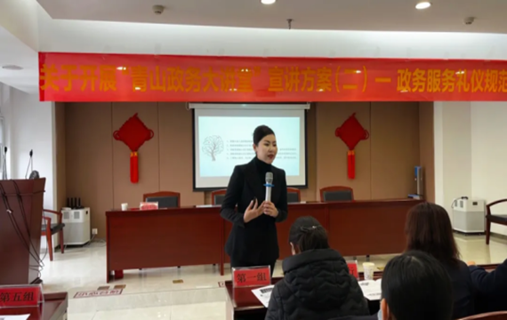 活动现场,专业礼仪培训师讲授政务礼仪课程。围绕政务服务中心业务,从服务意识开拓、职业化形象管理、行为举止、接待流程以及高效沟通等方面,通过现场演示、模拟场景、互动游戏等方式,提升商务礼仪运用能力,规范窗口人员服务行为。