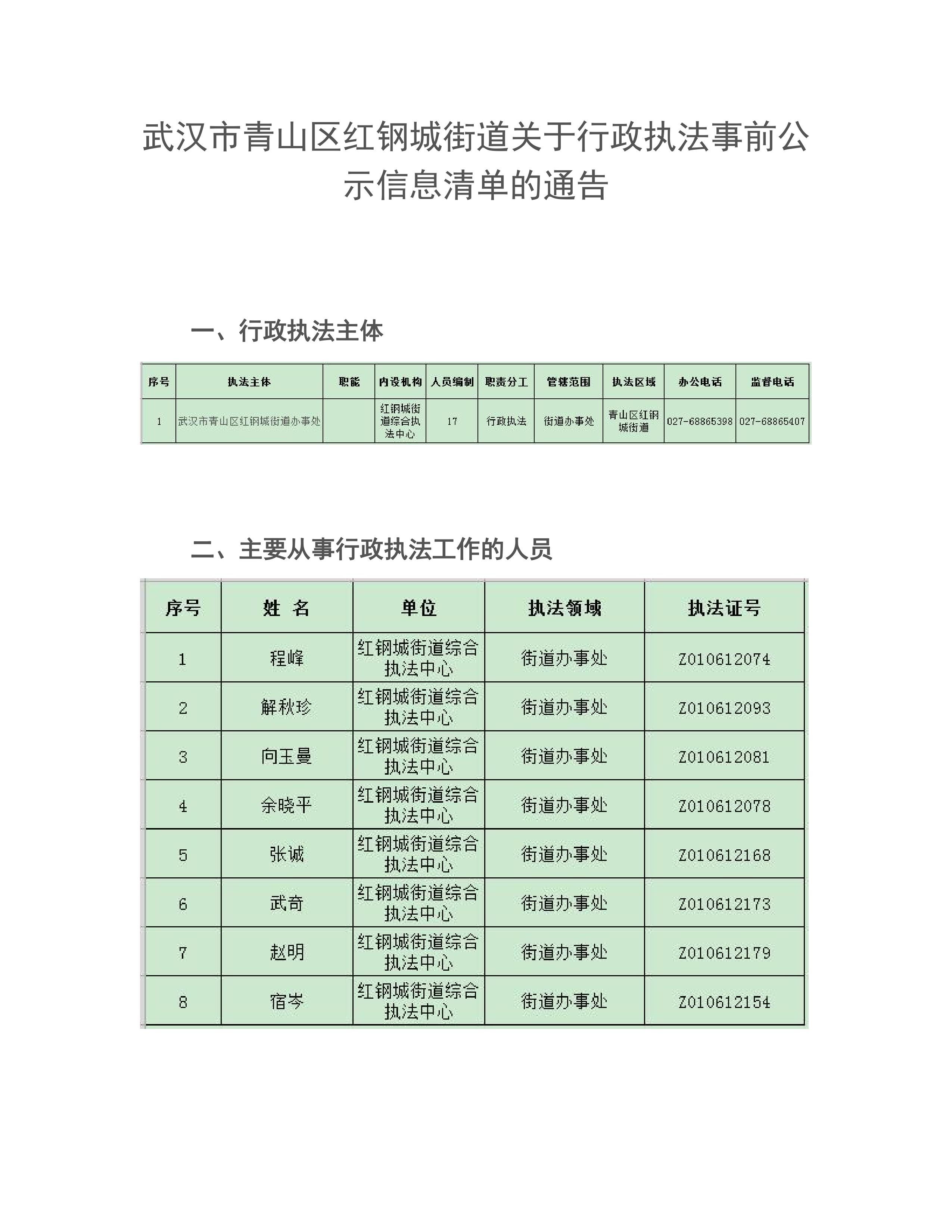 红钢城街道关于行政执法事前公示信息清单的通告
