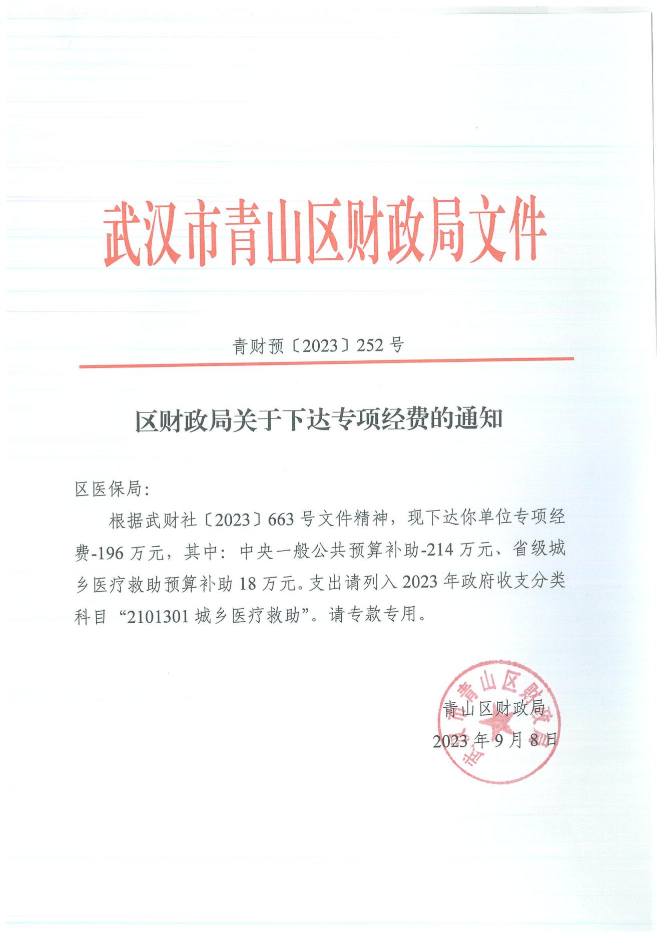 区财政局关于下达专项经费的通知 青财预[2023]252号