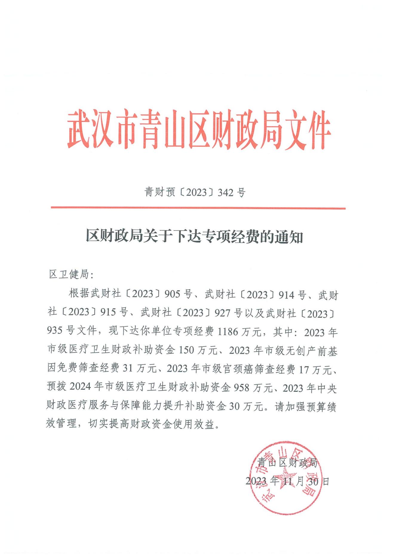 区财政局关于下达专项经费的通知 青财预[2023]342号