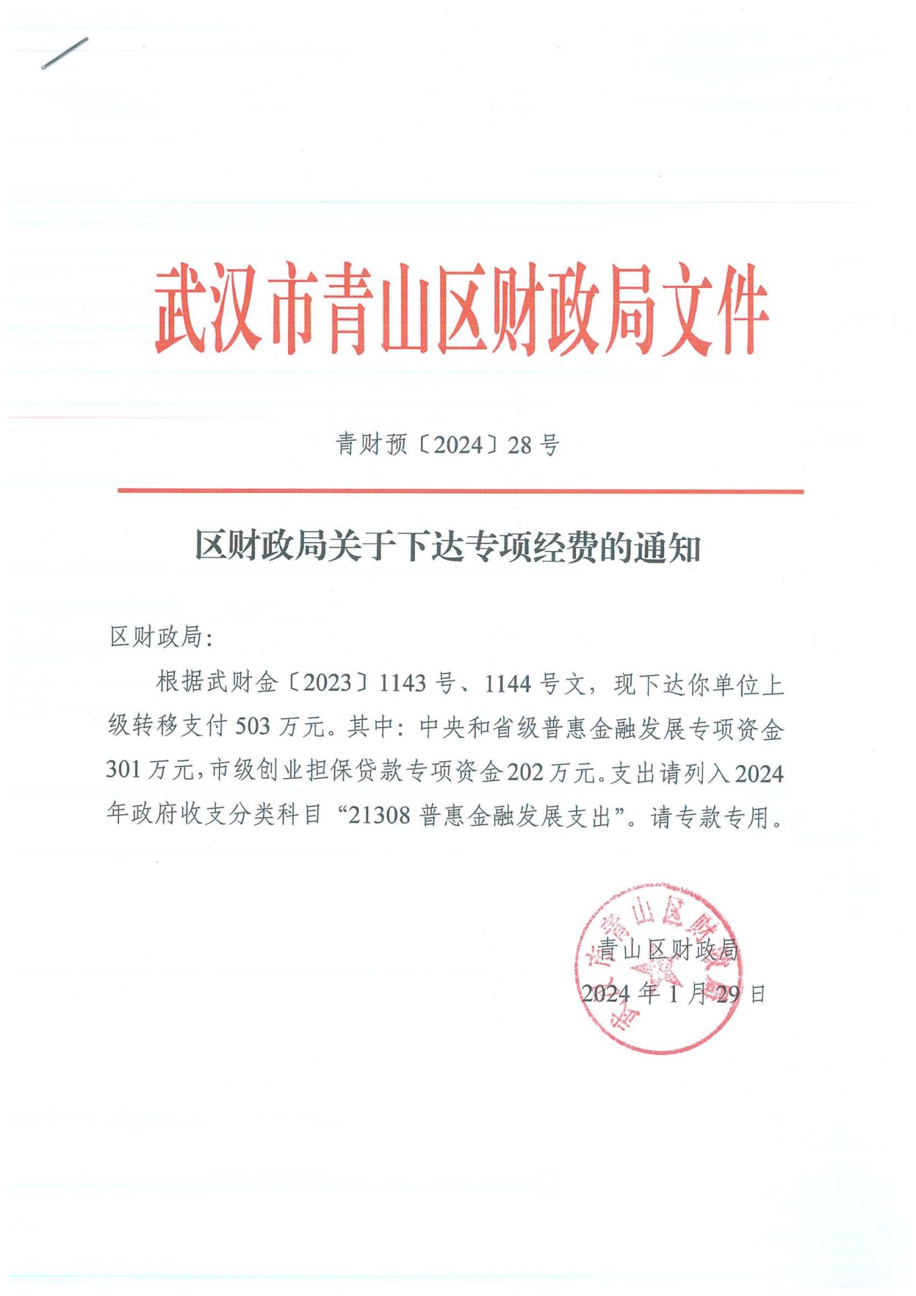 区财政局关于下达专项经费的通知 青财预〔2024〕28号